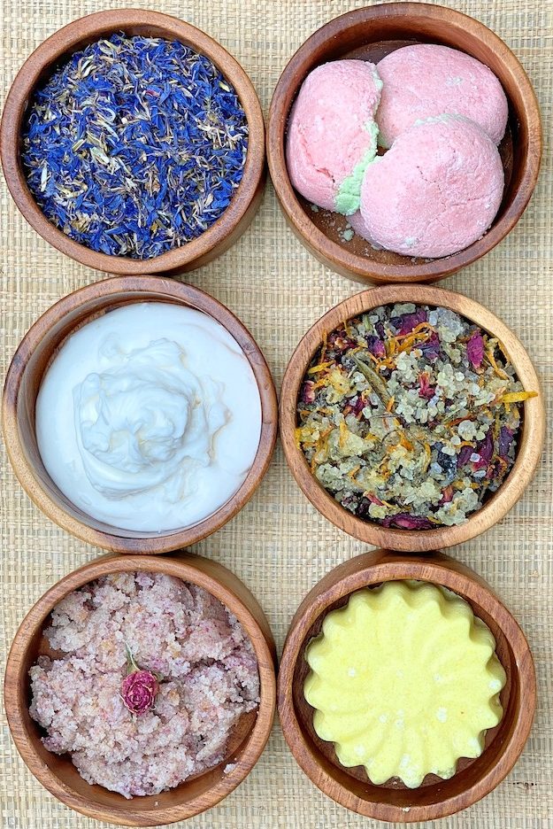 Pflegeprodukte, Lotionen, Cremes, Gels, bunte Badekugeln